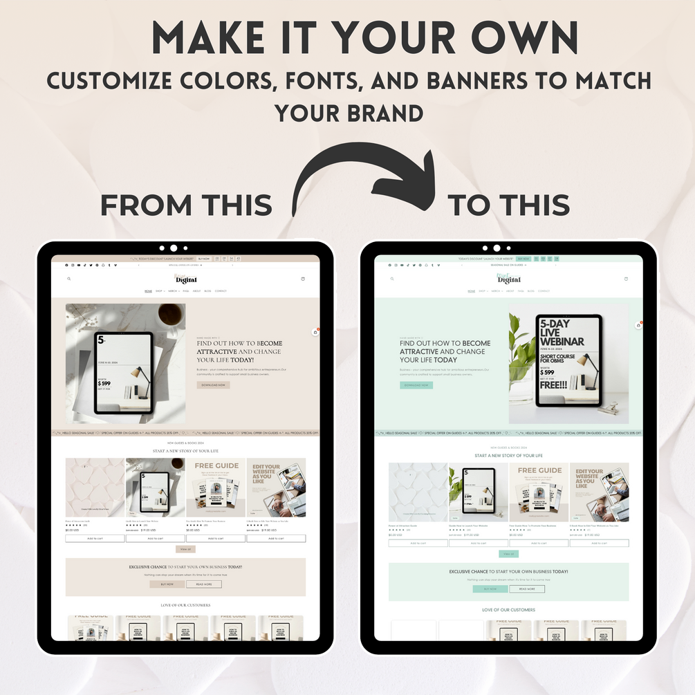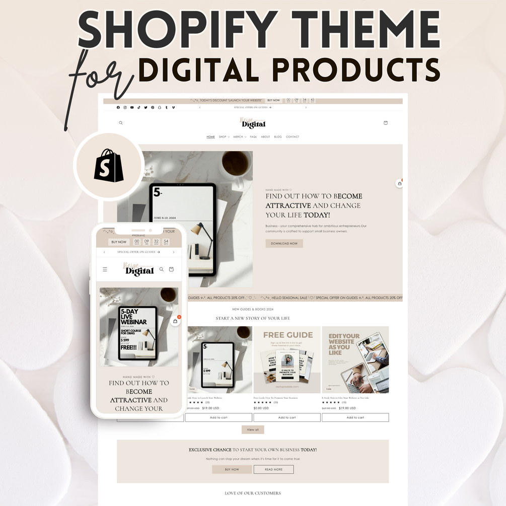 Digital Brown & Beige is the perfect theme for businesses selling digital products, including planners, digital marketing courses, faceless marketing solutions, social media tools, eBooks, workbooks, book templates, stock images, lead magnets, bundle deals, premium MRR products, and more. Featuring a sleek, modern design and extensive customization options, Digital Brown & Beige is crafted to highlight your brand and showcase your products beautifully. This theme ensures your products stand out and helps elevate your business to the next level. It is user-friendly and adaptable to meet your specific needs.