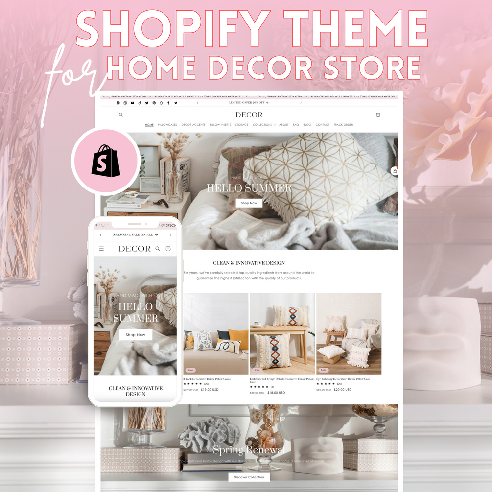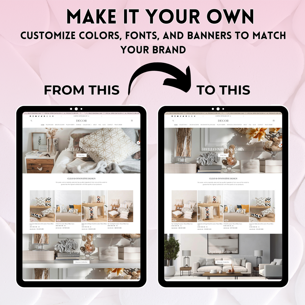 Decor Pink & Beige is the ideal theme for businesses selling wall decor, throw pillows, candles & home fragrances, clocks, picture frames & displays, seasonal decor, mirrors, wreaths & door hangers, home accents, flower arrangements, chair pads, fireplace screens, mobiles, decorative storage, faux plants & greenery, and more. With a sleek, modern design and extensive customization options, this theme is crafted to highlight your brand and showcase your products beautifully. Decor Pink & Beige ensures your products stand out and helps elevate your business to the next level. It is user-friendly and adaptable to meet your specific needs.
